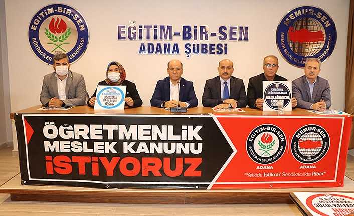 "Öğretmenlik Meslek Kanunu’nun çıkarılması hedefine 11. Kalkınma Planı’nda ve Bakanlığın 2023 Eğitim Vizyonu Belgesi’nde yer verilmesinin üzerinden üç yıl geçmesine rağmen, ne yazık ki öğretmenlerin mesleklerini, hak ve yetkilerini koruyup geliştirecek nitelikte bir meslek kanunu beklentisi hâlâ karşılanamamıştır" diyen Eğitim-Bir-Sen Adana Şube Başkanı Mehmet Sezer açıklamalarını şöyle sürdürdü; Eğitim çalışanlarının güçlü sesi, genel yetkili sendikası olarak, gerek akademik yayınlar gerek raporlar gerekse alan taramalarıyla Öğretmenlik Meslek Kanunu için nelere ihtiyaç duyulduğunu ortaya koyduk.